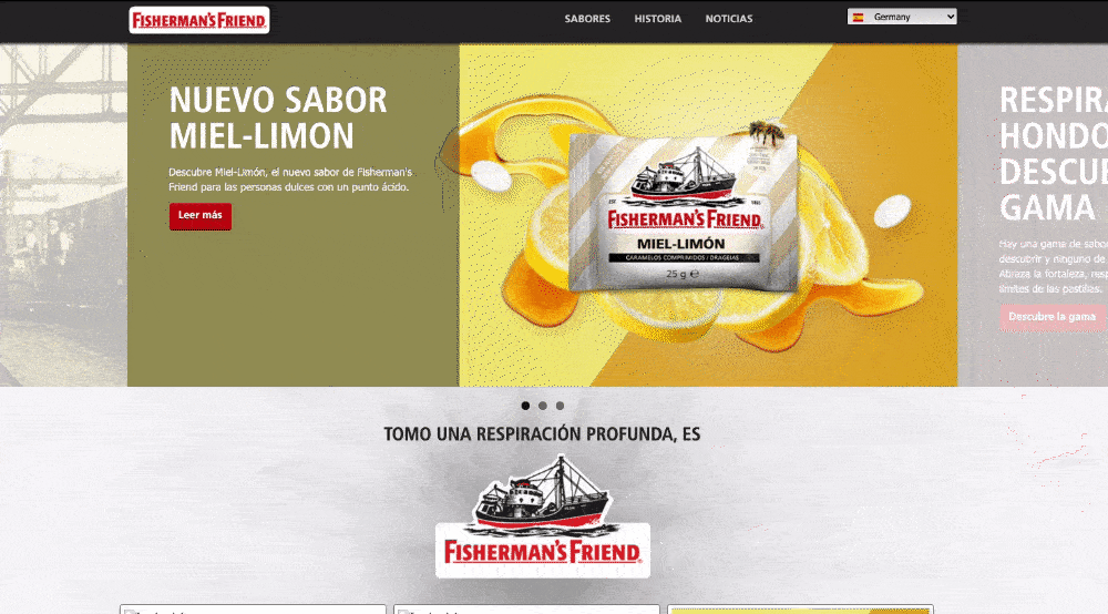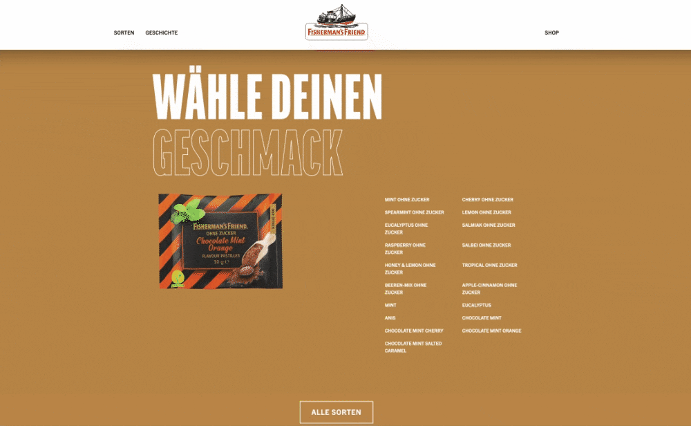 Die Menthol-Pastillen der Marke Fisherman’s Friend waren vor 166 Jahren ihrer Zeit voraus und sind heute immer noch mehr als zeitgemäß. Die imposante Geschichte und die „Freshness“ der Marke müssen daher genauso innovativ transportiert werden. Eine animierte History Section mit horizontalem Scrolling und der Einsatz diverser Storytelling-Elemente schaffen das eindrucksvoll.